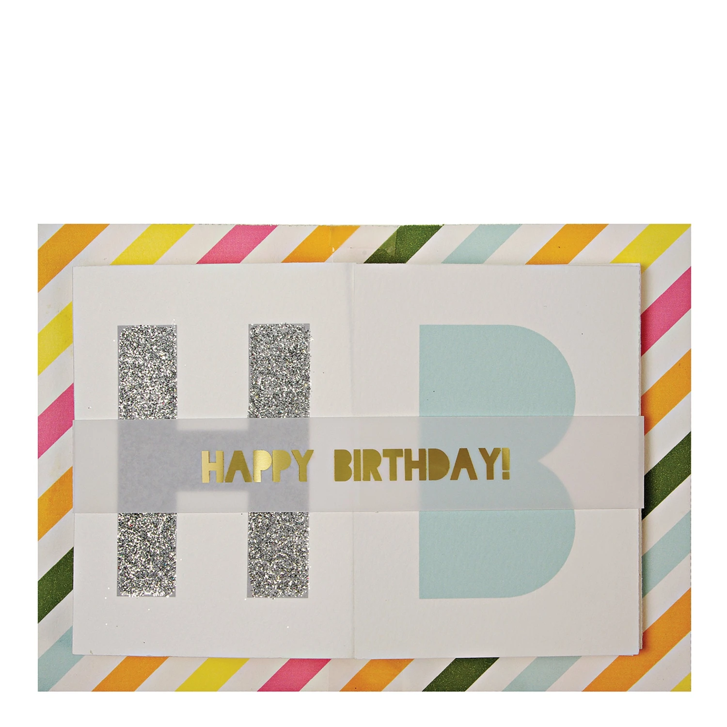 This clever beautifully crafted card opens up to reveal a bright and colorful ‘Happy Birthday’ banner. Strikingly embellished with silver glitter and shiny gold foil. Comes with a multicolored striped envelope.