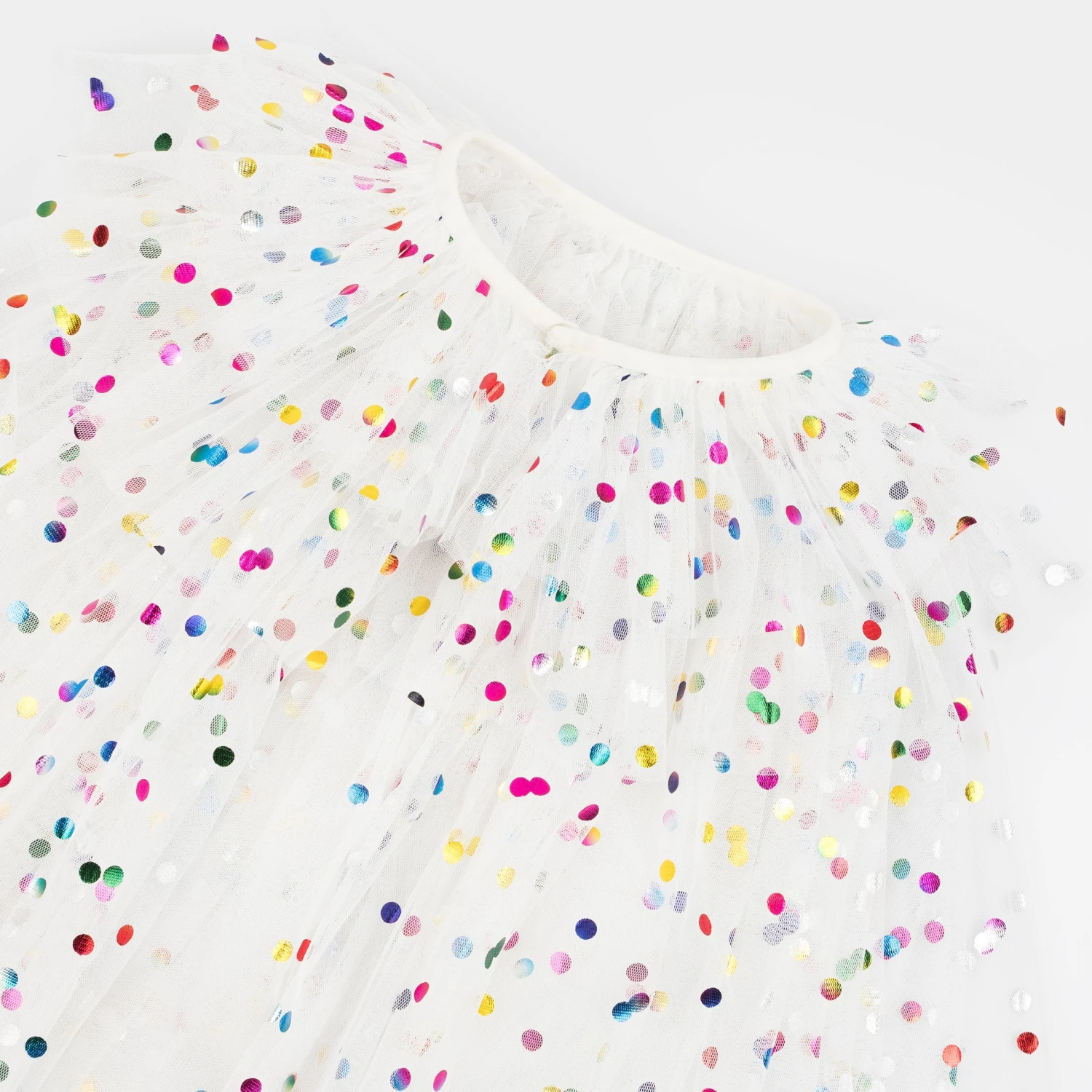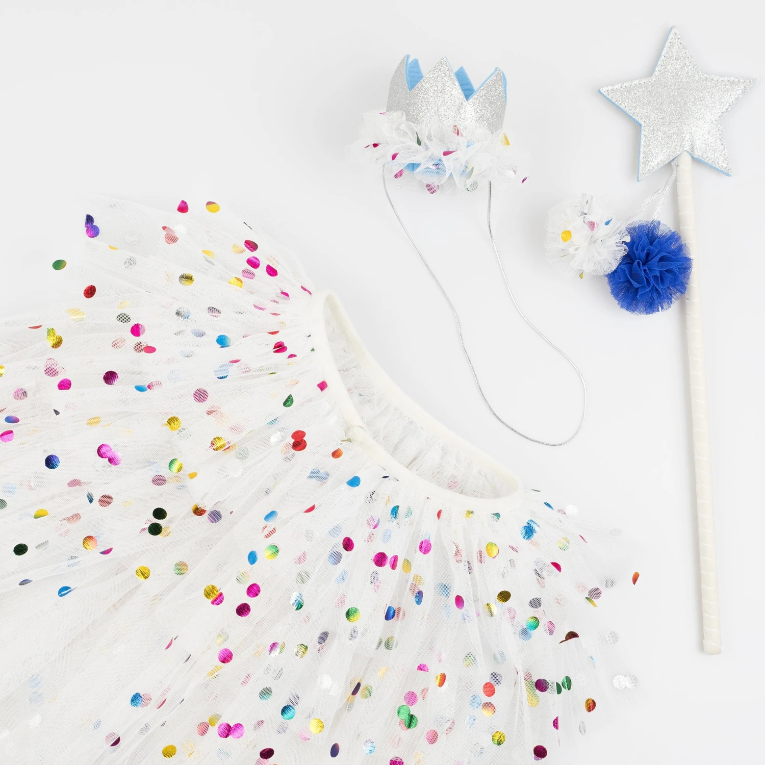 This beautiful luxury dress up set includes a four tiered tulle cape, crown and a star wand with on-trend pompom details. The metallic foiled dot design shimmers like little jewel tones, giving a wow-factor rainbow of colors. This is perfect to wear to special celebrations or for imaginative play.
