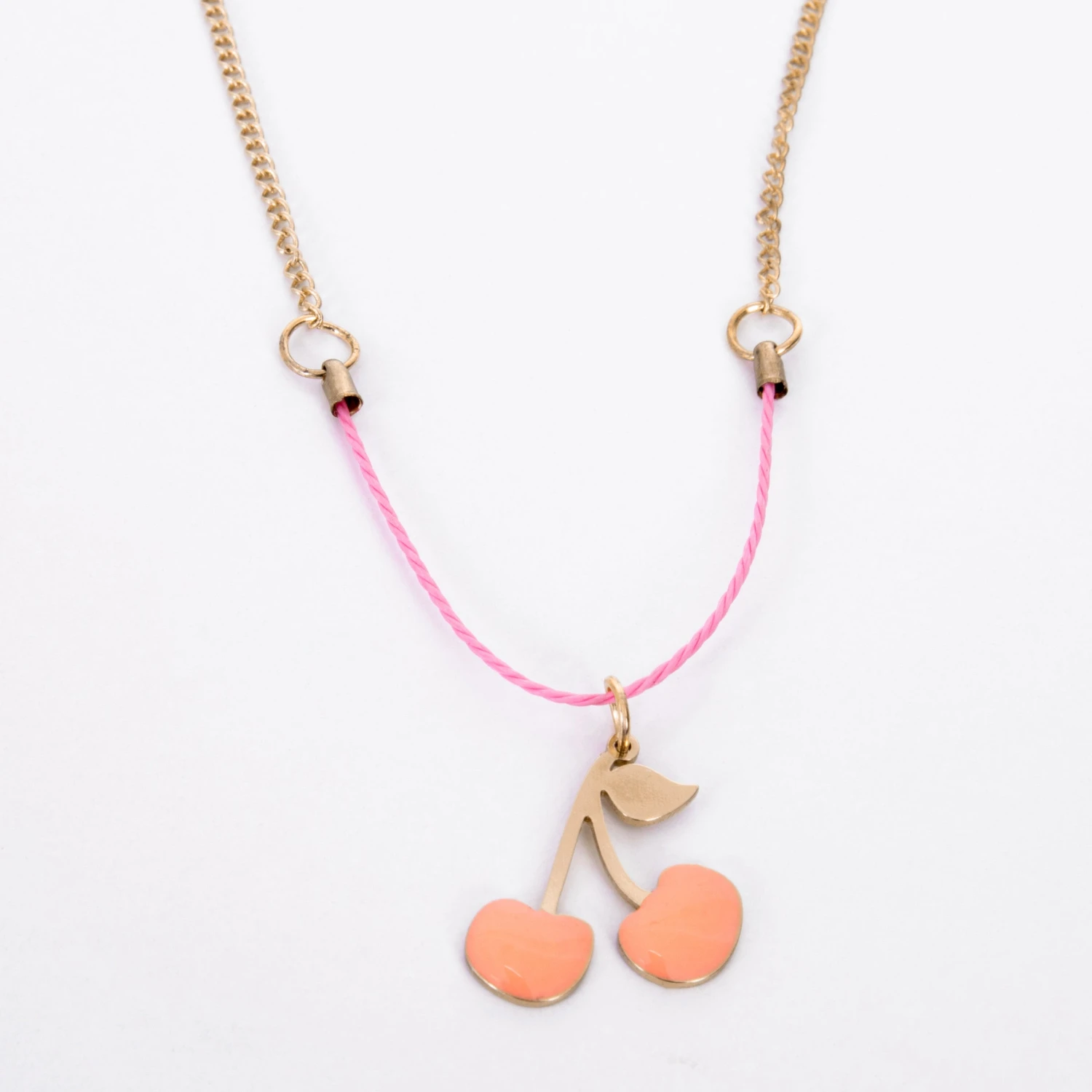 Cherries are a delightful decorative fruit, and look amazing as an enamel charm. This bright necklace adds a touch of charm to make any outfit look special.
