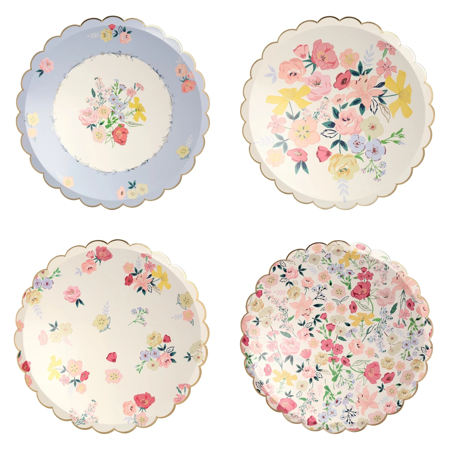 Looking for pretty plates for your party? Our elegant English Garden dinner plates are perfect for a tea party, engagement, wedding or anniversary. Each pack features four gorgeous floral designs with stunning gold foil detail.