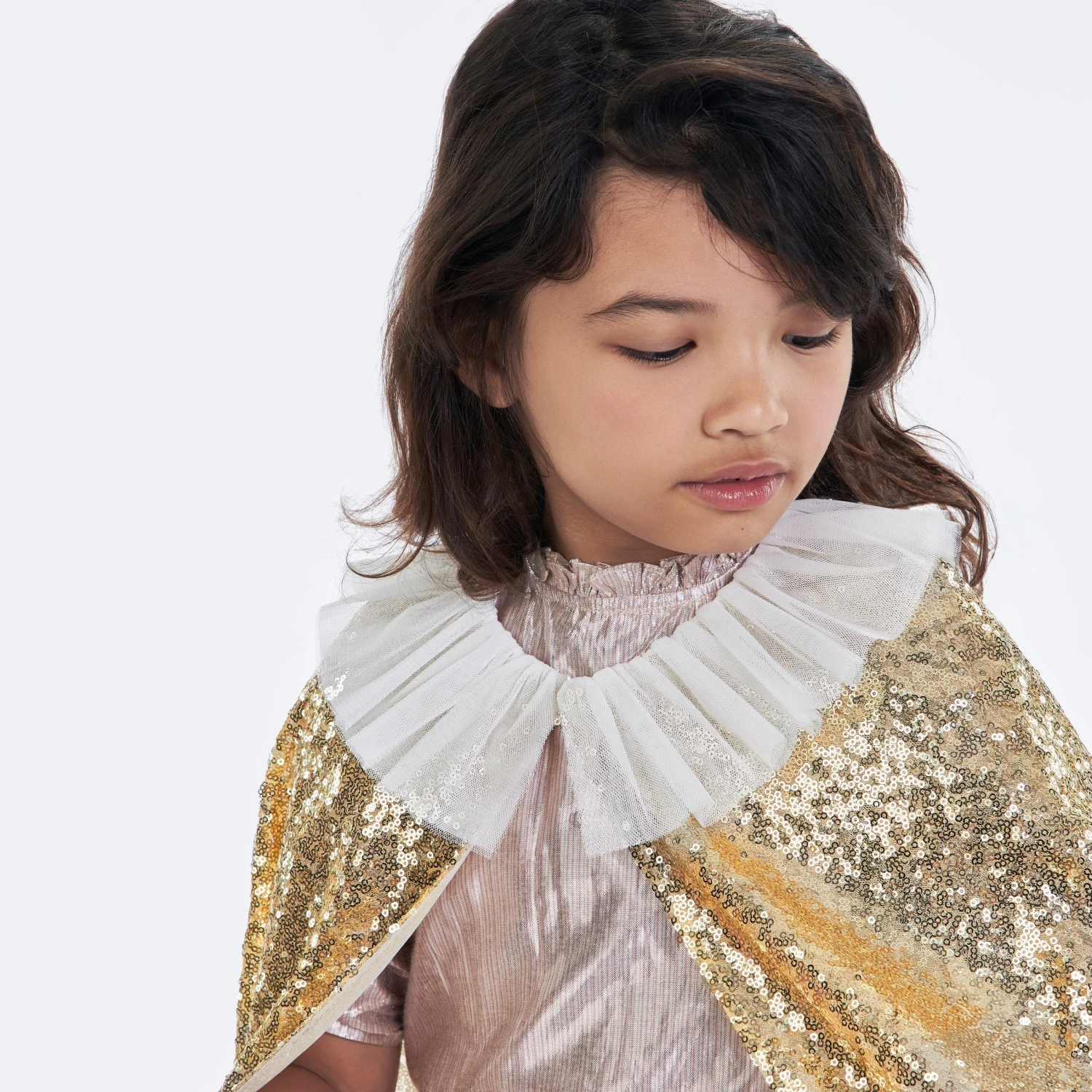 This gorgeous gold cape is a fabulous way to look extra special for any party or celebration. It’s also ideal for imaginative play on any day. It’s beautifully crafted from a lined gold sequin fabric, with an elegant white tulle collar. It comes with a gold sequin star wand, perfect to majestically wave around.