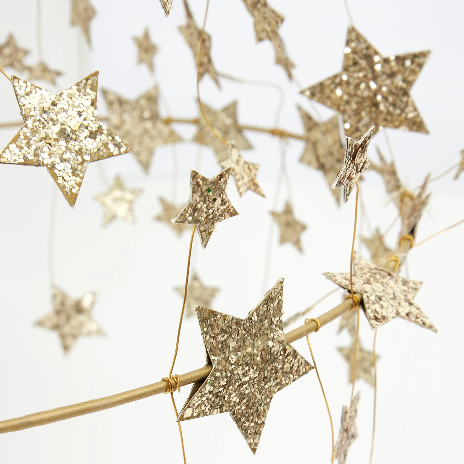 This gorgeous chandelier is a stunning way to add a touch of style to any room. It’s beautifully crafted with lots of glittering gold stars with gold wire and thread. Perfect for the holidays, or any time of the year where you want a decoration that is the star attraction!