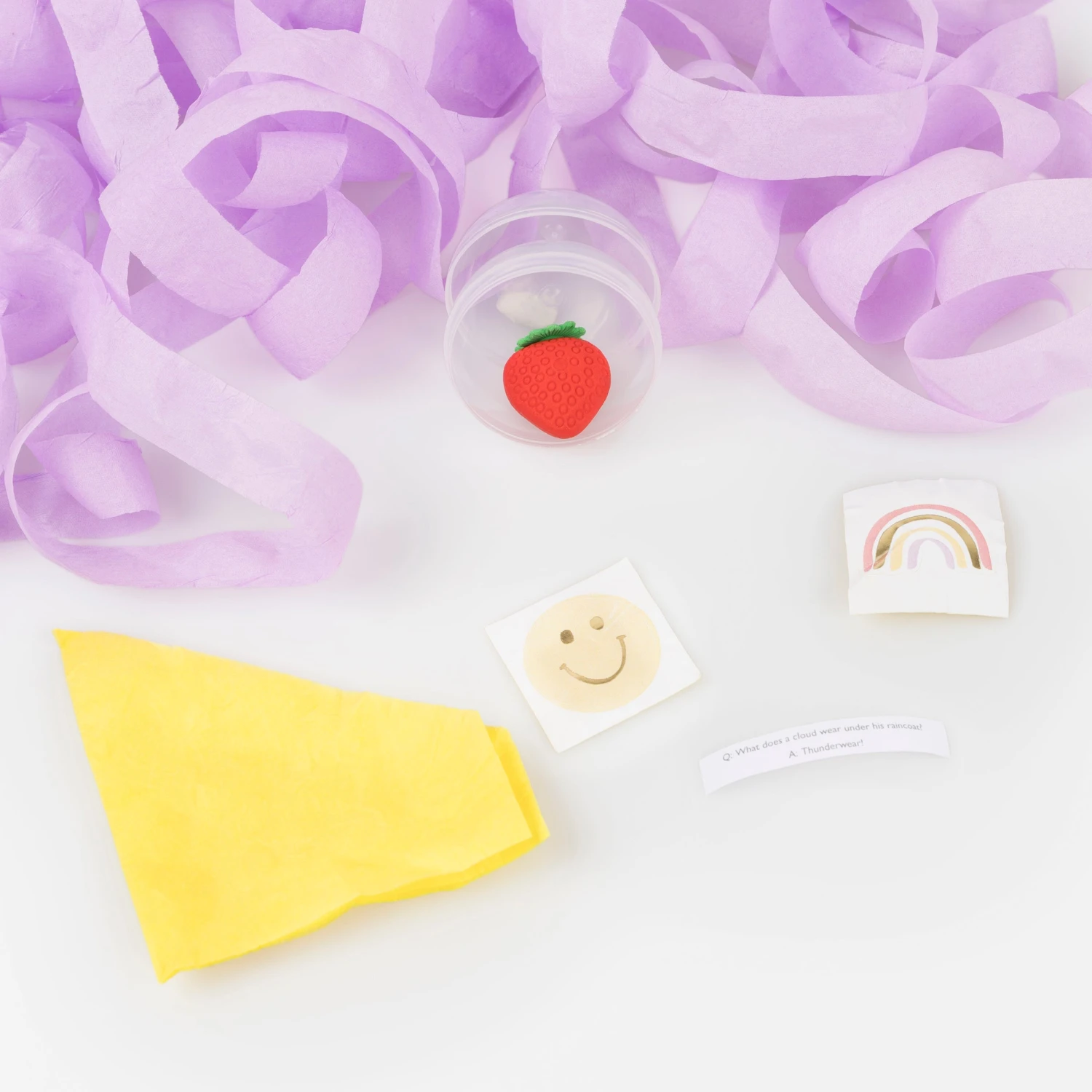 Give your guests a happy surprise with these smiley face balls. Crafted with bright crepe paper colors, they each contain 2 stickers, a joke, a yellow tissue paper hat and a strawberry shaped eraser. Pop them on the table as a fabulous decoration, or add to party bags.