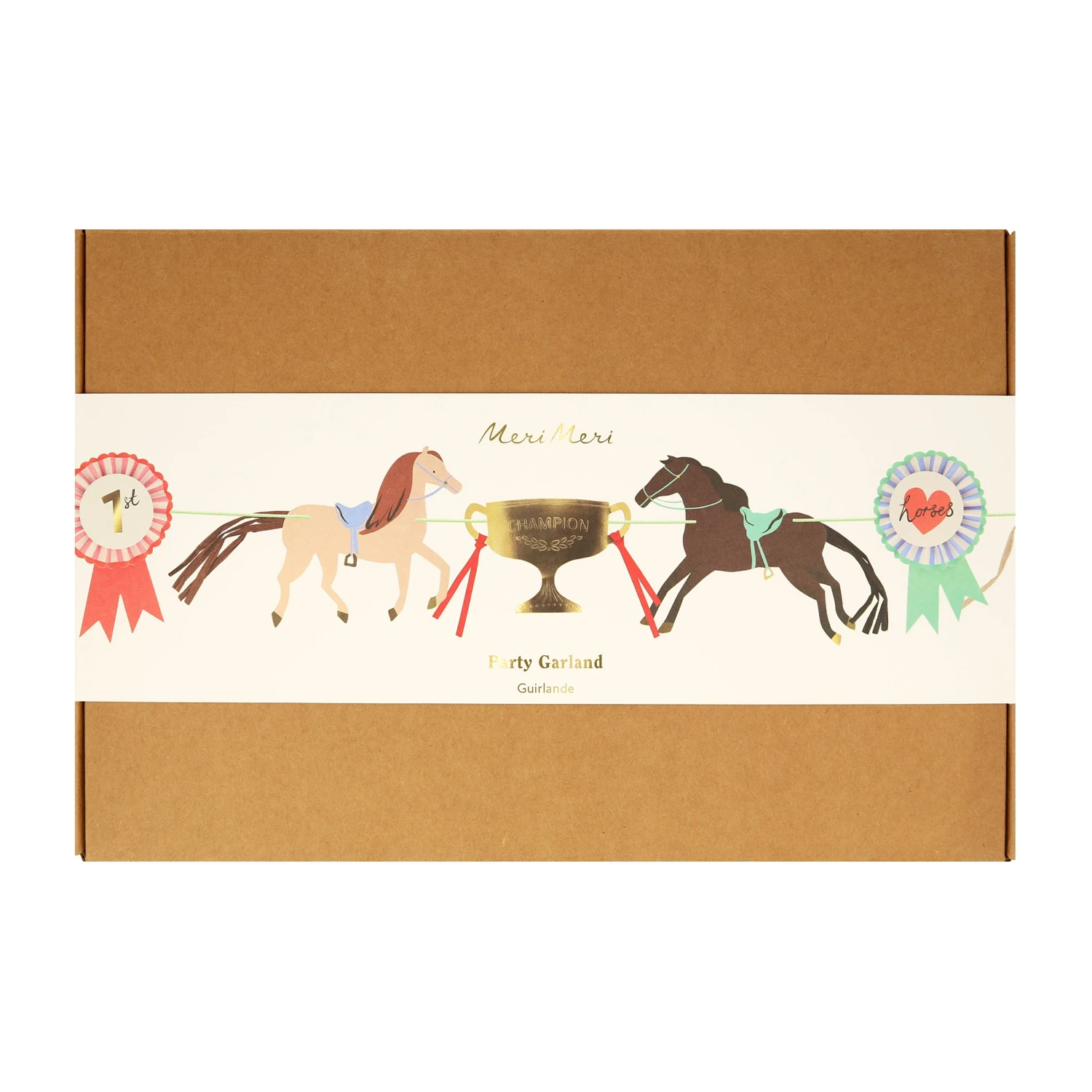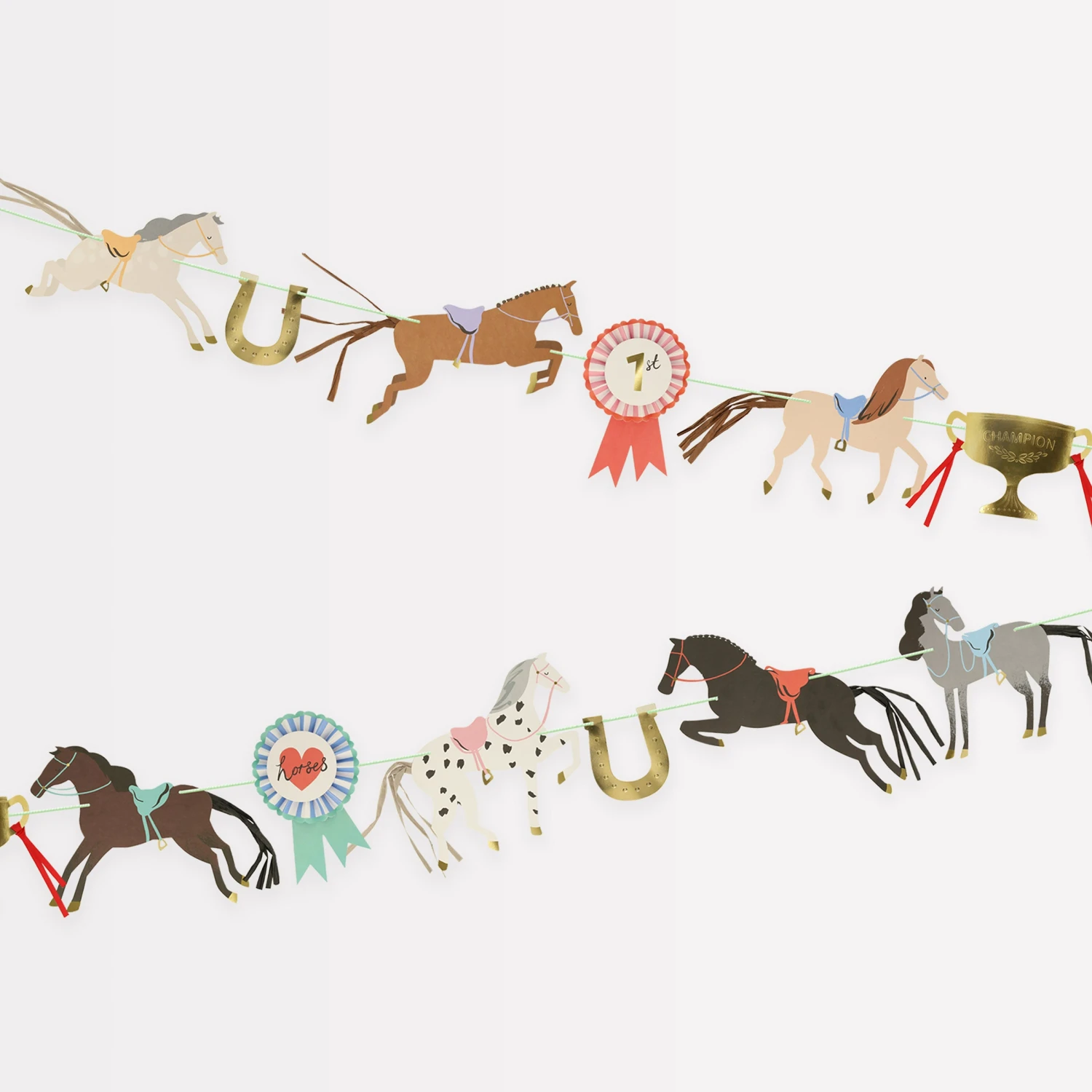 This gorgeous garland will make your guests gallop with glee! The combination of horses, shiny foil horseshoes, a champion cup and colorful rosettes will look perfect on the party table or on the wall. It’s also a wonderful decoration for a horse-mad child’s bedroom.