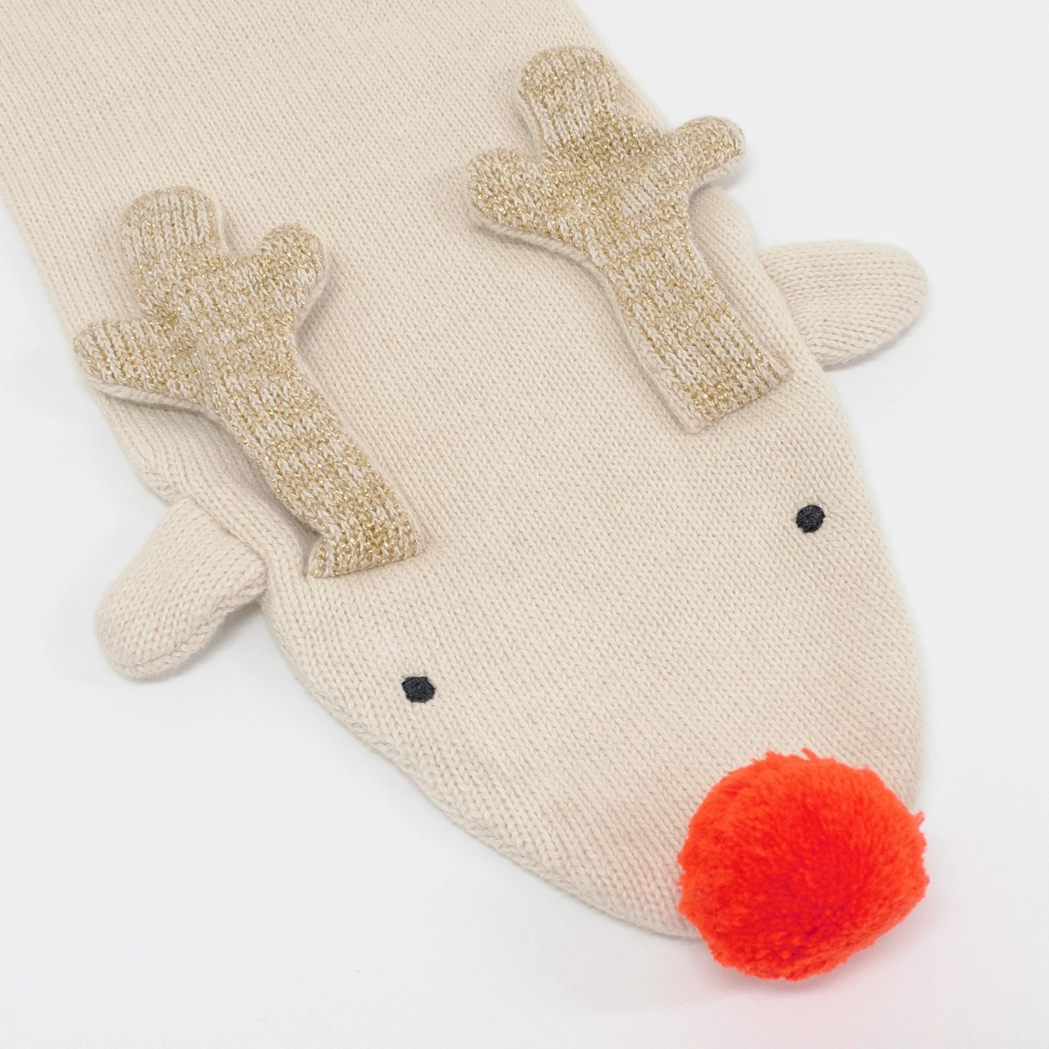 This beautiful reindeer scarf, complete with a bright red nose, is an adorable accessory for cold days. A fabulous gift to receive! It is made from soft organic cotton with sweet stitched features.