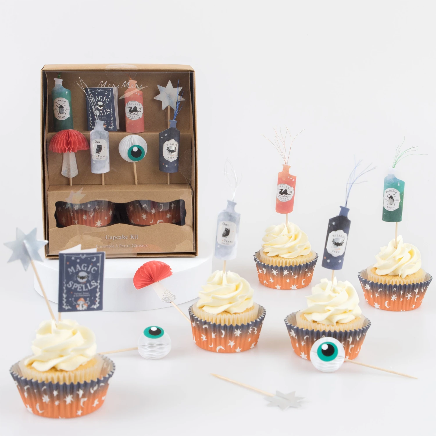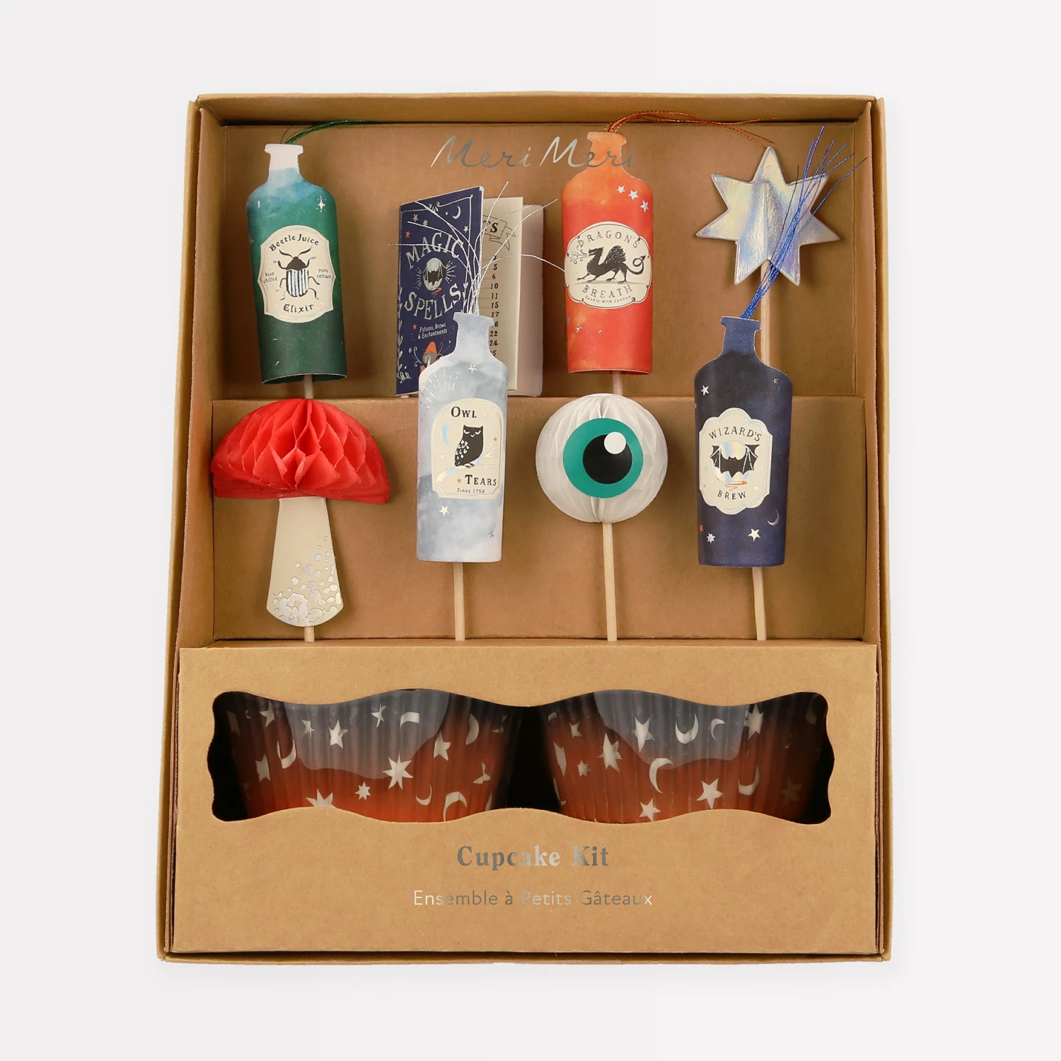 Get ready to make spellbinding cupcakes! This special kit contains magic potion themed cake toppers and ombre starry night cupcake cases, ideal for magical party treats or for Halloween. It’s beautifully presented in a kraft box, designed to look like a wizard or witch’s store cupboard, so makes a great gift too.