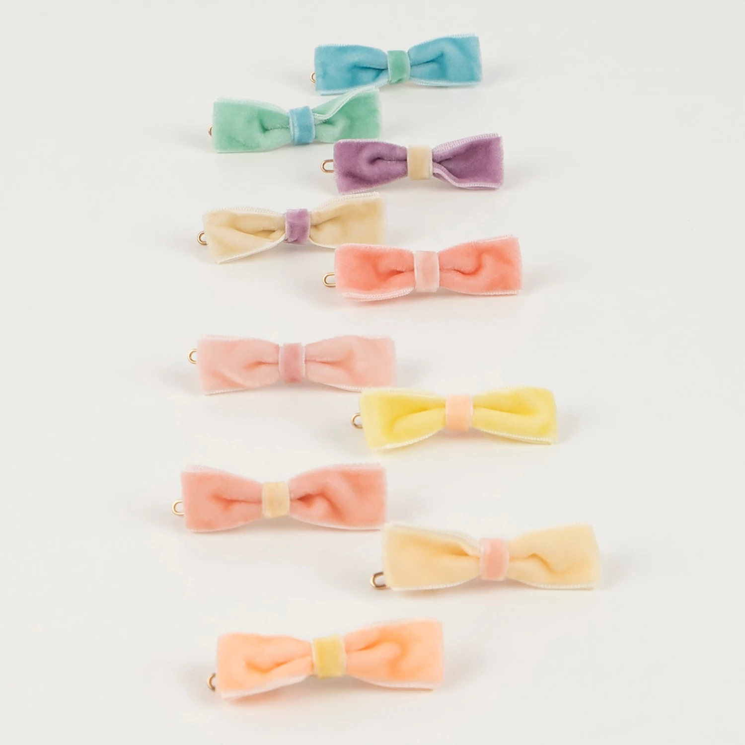 These mini bow clips, crafted from sumptuous velvet ribbons, are perfect for party wear, or a stylish look everyday. The set includes 10 pastel shades, with coordinating centers.