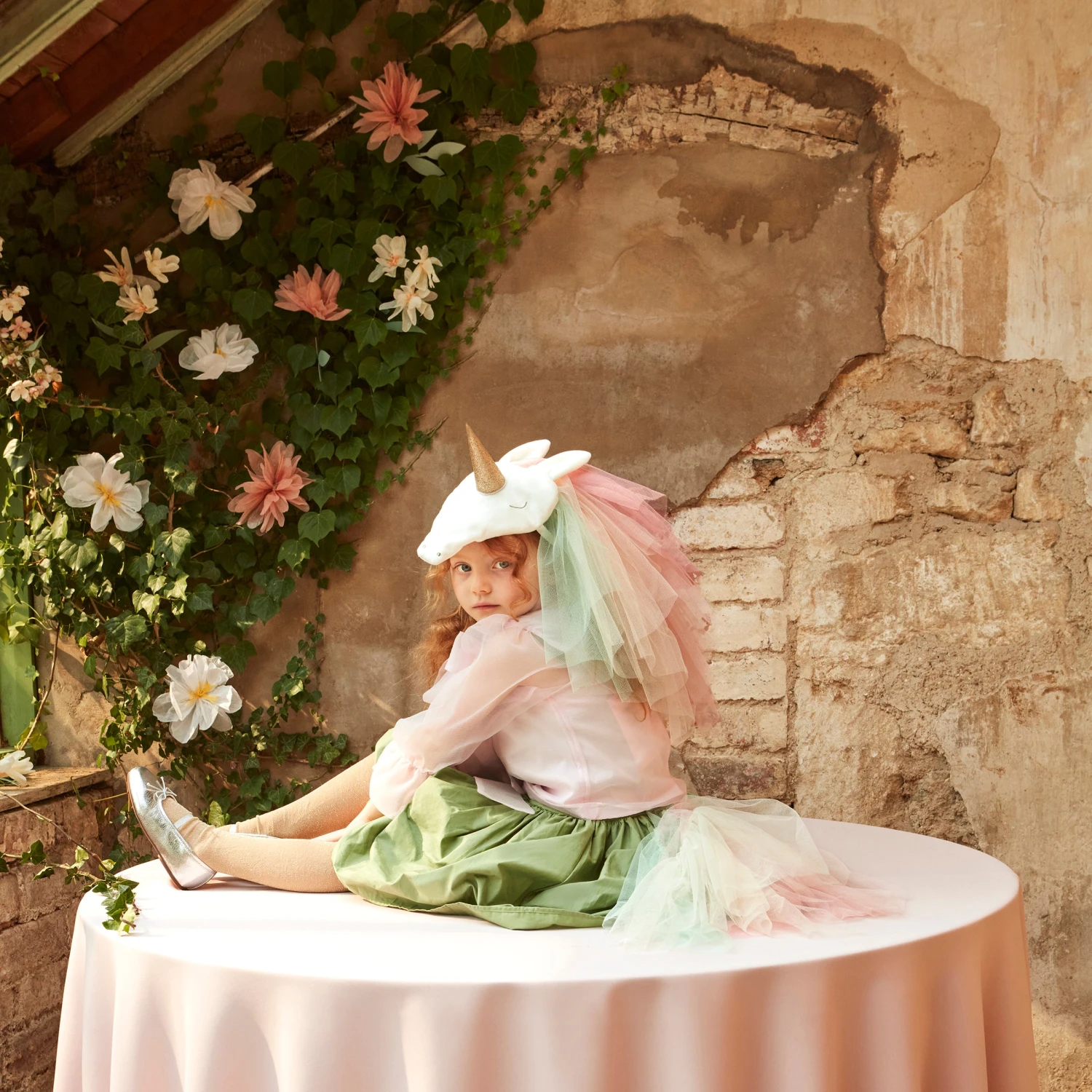 Unicorns are magical! Bring these mythical creatures to life with our 2 piece dress up set. It features a velvet unicorn headpiece with a glitter fabric horn and embroidery, and a velvet waist band with a colorful tail. The mane and tail have lots of layers of vertical sewn tulle in rainbow colors. A truly magic outfit to wear to parties or for hours of imaginative play and fun.