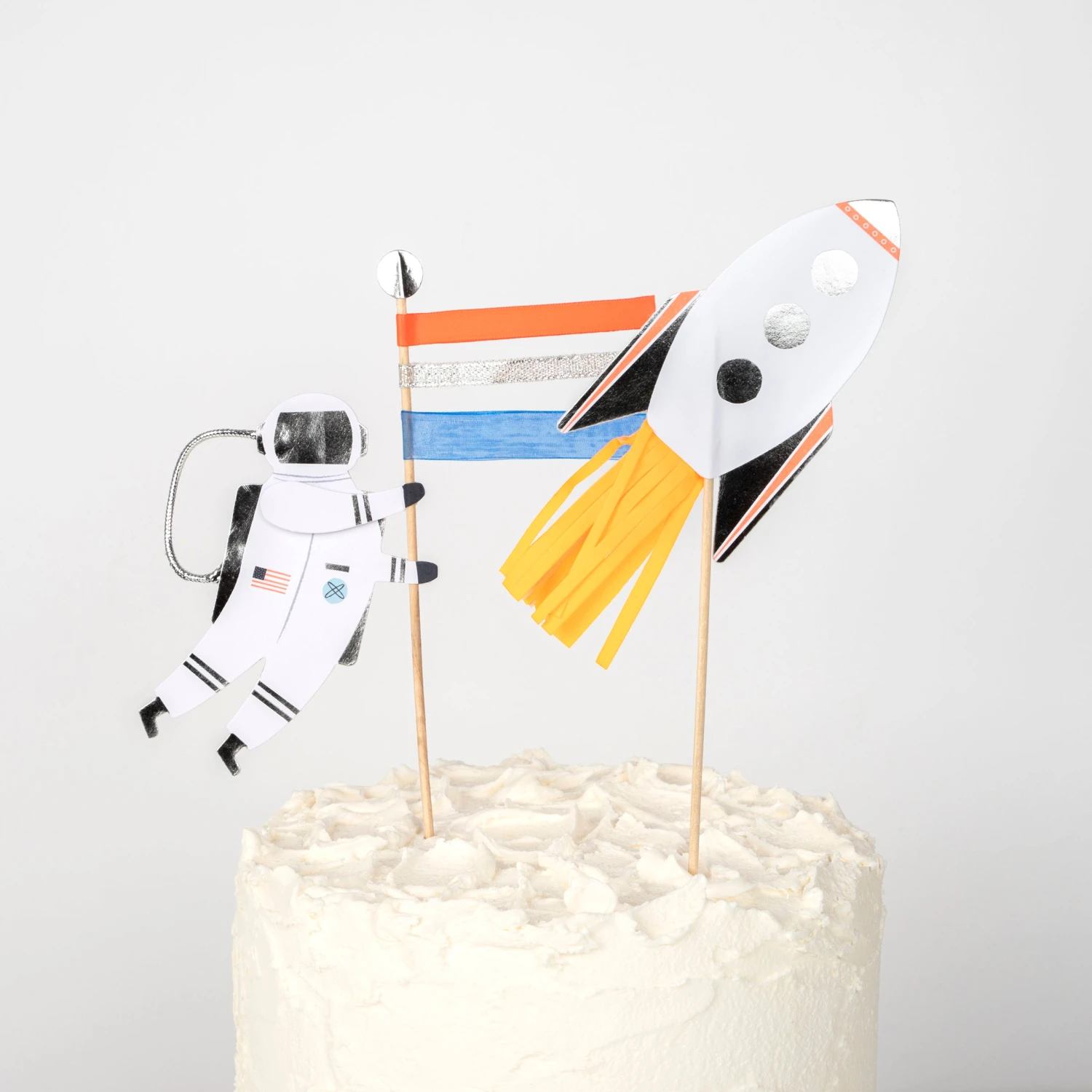 Turn a space cake into something really sensational with this topper set. It features a spaceman holding a colorful flag, and a rocket blasting off to the skies.
