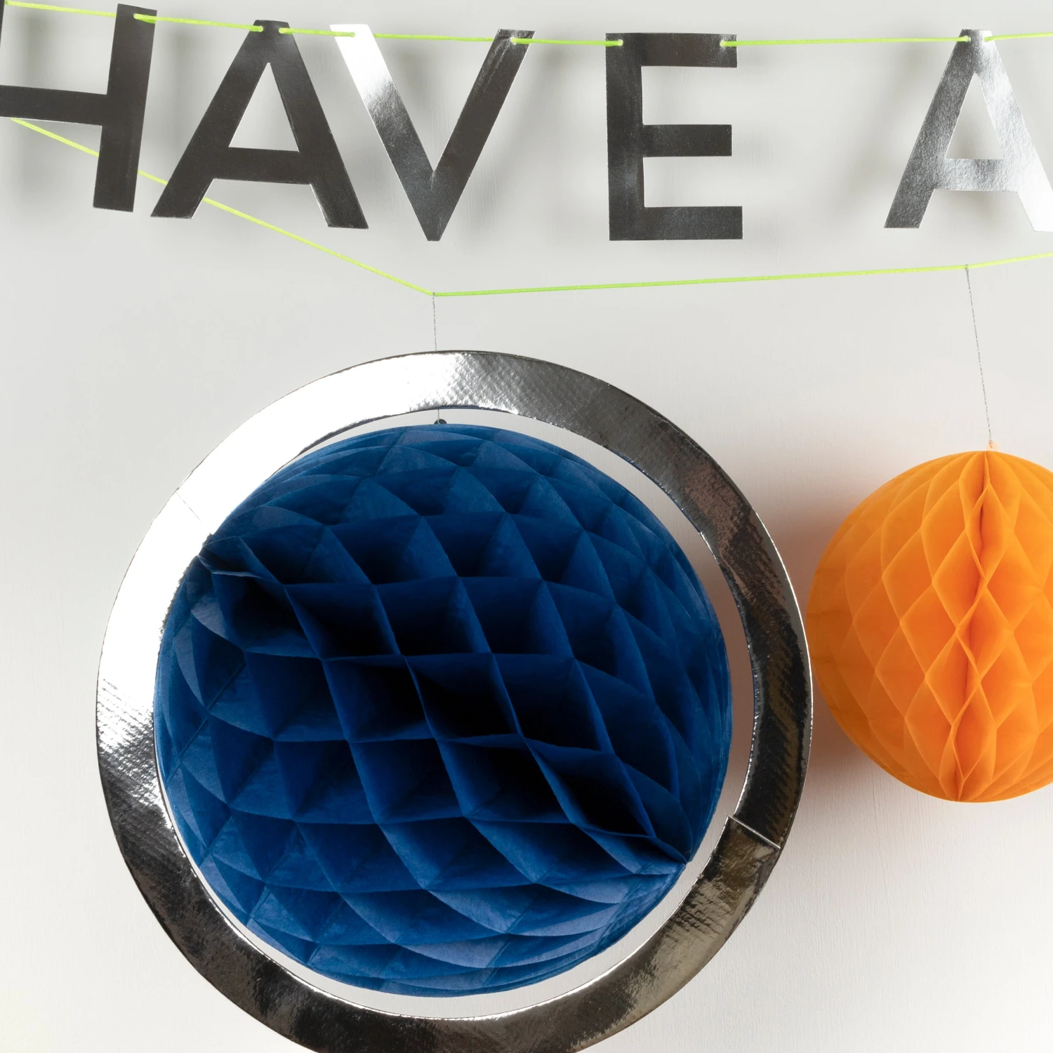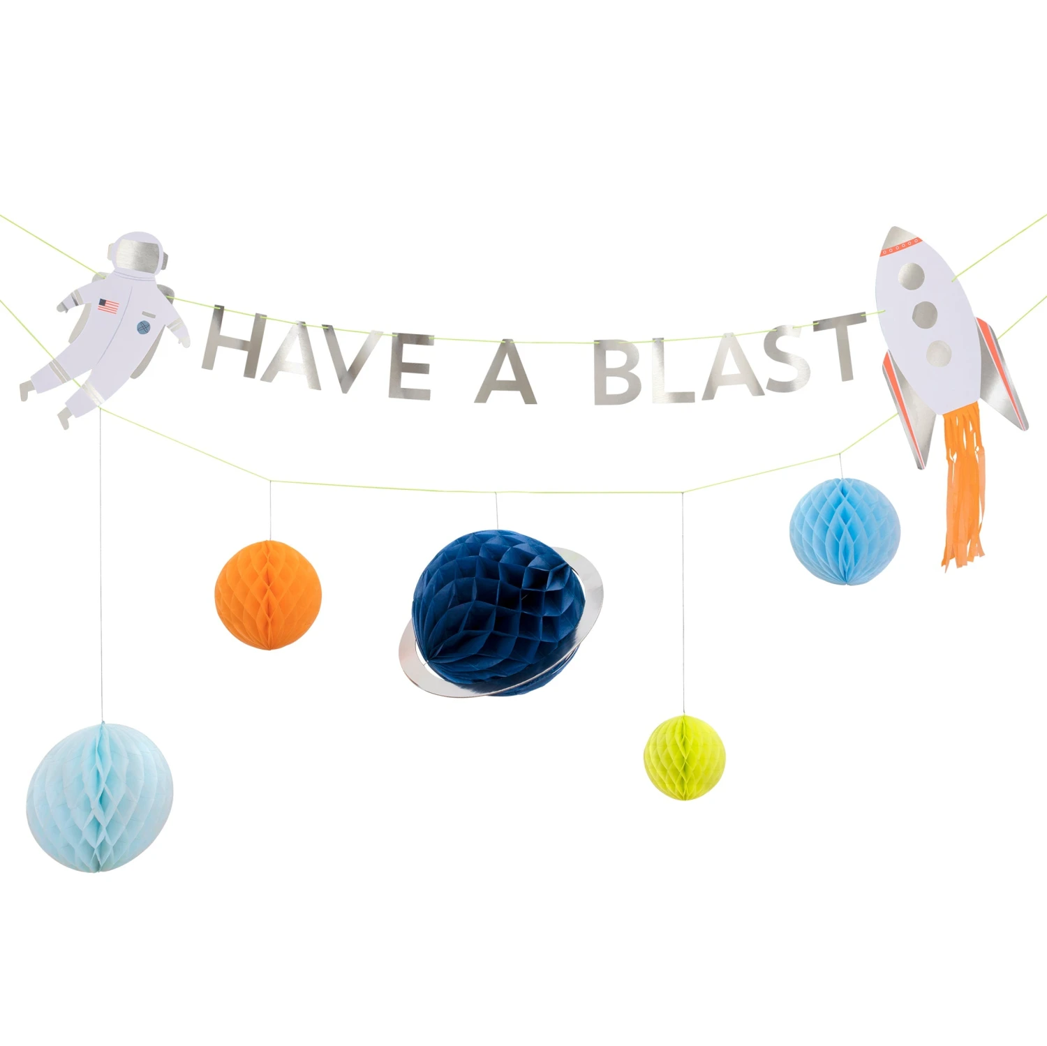 The combination of two garlands in one makes the most fabulous decoration. One has the wording ‘Have A Blast”, and a shiny spaceman and rocket, with another of brightly colored honeycomb planets. It’s guaranteed to delight your guests!