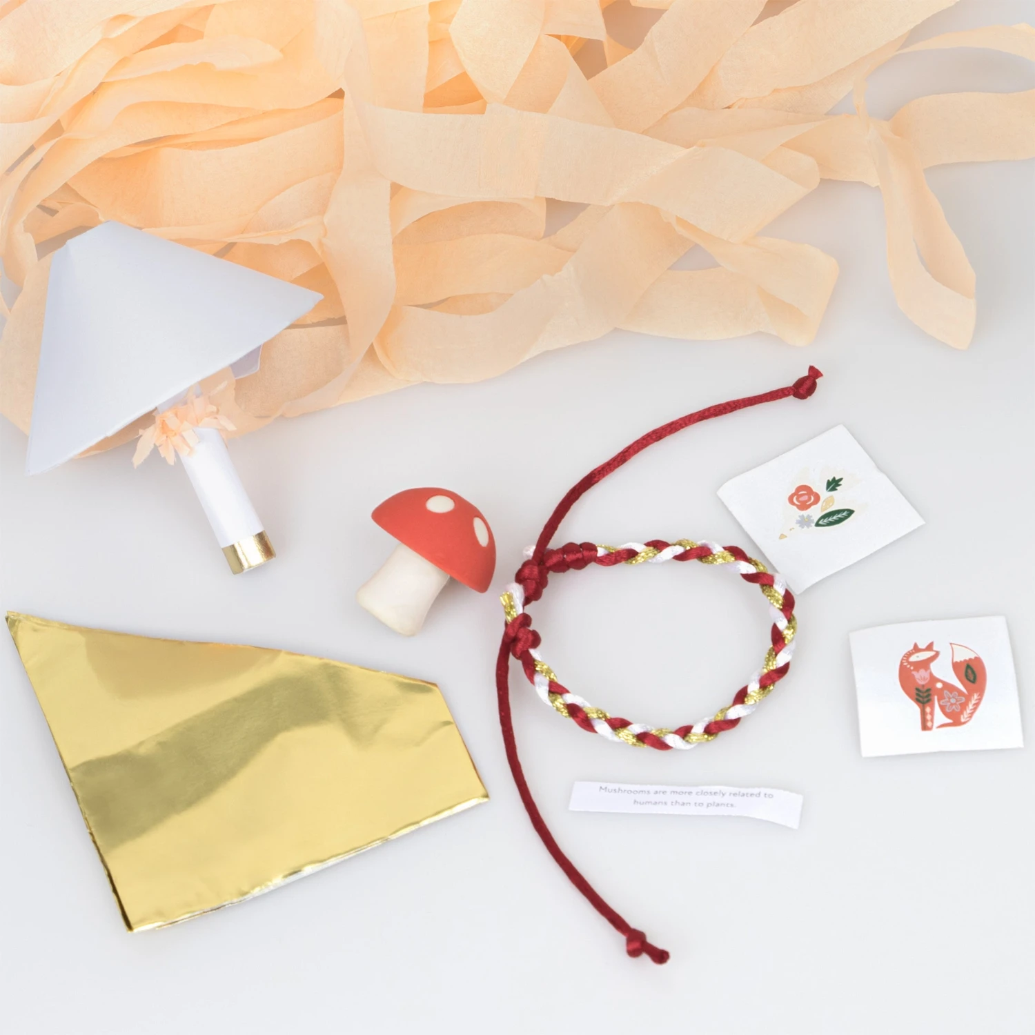 Is it a decoration or a party favor? Surprise, it’s both! These on-trend mushroom designed gifts will look amazing on your party table and delight your guests. Simply unwrap to reveal a mushroom-shaped eraser, gold foil party hat, a trivia, 2 stickers and a friendship bracelet. They’re great to pop into party bags too – ideal for a fairy party, woodland themed party or any special Fall celebration.